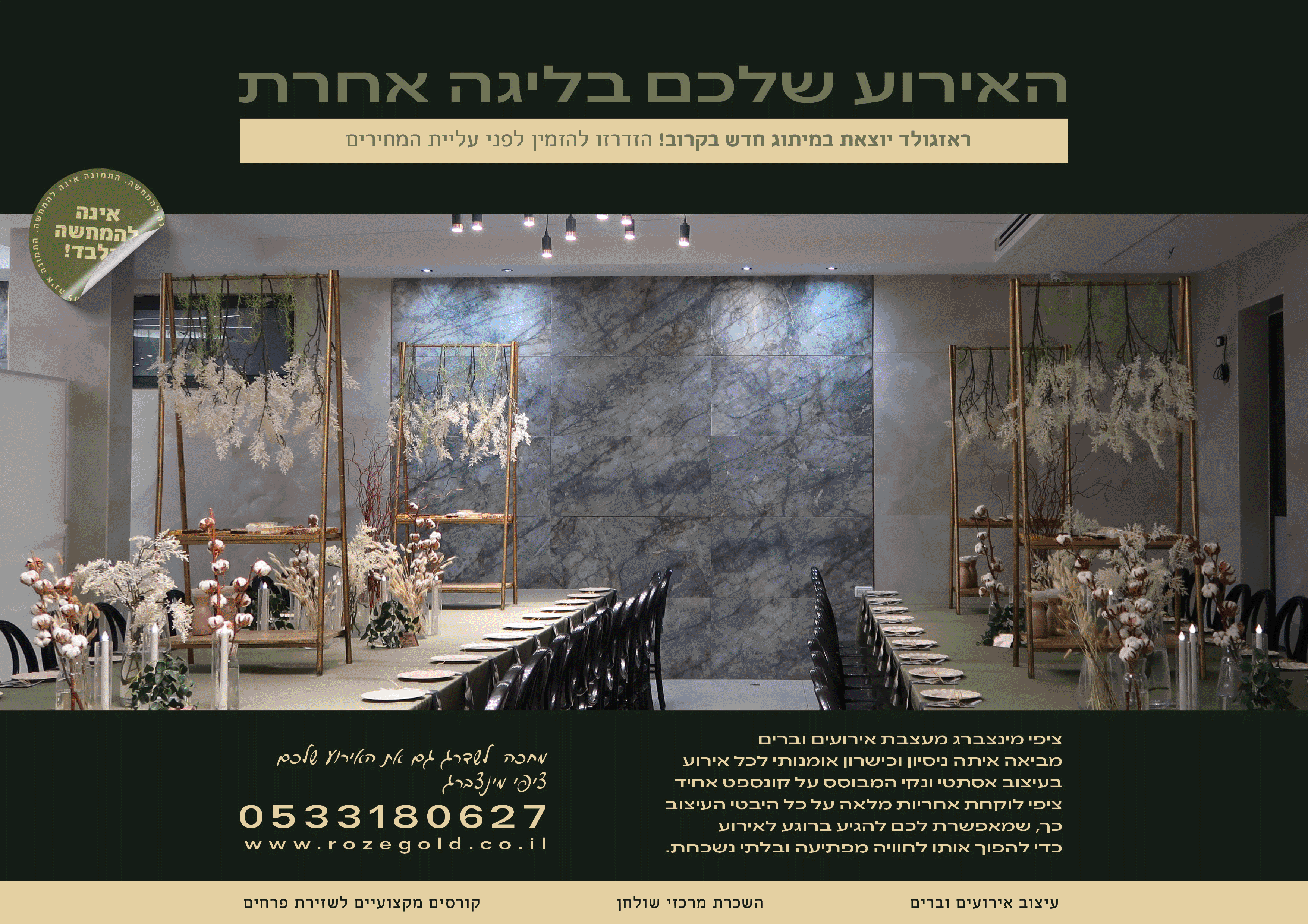 אירסתם? חוגגים בר/בת מצווה? מתכננים אירוע מרגש? בראזגולד נהפוך את המעמד שלכם לבלתי נשכח! אצלנו ניתן להוסיף לכל אירוע נגיעה של קסם – ממרכזי שולחן מרהיבים ועד לעיצוב מוקפד של כל פרט ופרט. רוצים לשדרג לרמה מעל? אנחנו כאן גם כדי להקים עבורכם בר ייחודי ומעוצב בדיוק כפי שחלמתם! רוצה לדעת איך יוצרים את כל היופי הזה - ועוד הרבה יותר? הקורס הייחודי שלנו מותאם בדיוק בשבילך! תיכנסי לעולם הקסום של עיצוב הפרחים, תלמדי כיצד לשזור מרכזי שולחן יחודיים, קישוטי שיער אלגנטיים, לעצב זרי כלה מרשימים, ועוד שלל טכניקות מרהיבות. רוצים לקבל עוד פרטים? מתלבטים מה מתאים לכם? אנחנו כאן בשבילכם - צרו איתנו קשר!